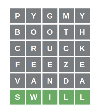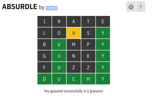 One of my biggest complaints about the original Wordle is that at times it feels a bit too easy - rarely does it take more than five guesses (even on Hard Mode), and when it does it’s often due to having four of the five letters and needing to cycle through the different possibilities to find the answer. In some sense Absurdle fixes this problem by intentionally designing the game to be as difficult as possible. I think that’s certainly a neat concept. But for me, the manufactured nature of Absurdle’s difficulty makes it fall short for me in terms of actually being an enjoyable game to play. Because of the way Absurdle is designed, racking your brain to come up with guesses feels a bit pointless since you know the game will just render them as useless as possible anyways. Sure, you can try to optimize your strategy to force the game to give the answer in as few guesses as possible (apparently the minimum is four), but doing so seems more like an exercise in computational brute force and less like an actual word-related brain teaser. The most Wordle fun I’ve had has come from hitting home runs off of wacky guesses. Absurdle ensures that these guesses won’t give you that same gratification. And I don’t like that!