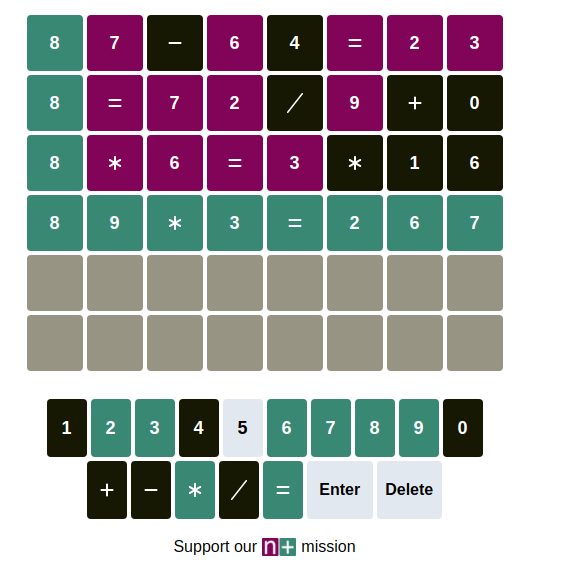Math Wordle - players try to guess a math equation instead of a word. A simple picture might be more informative than me trying to explain how this works, so consult the image below to see how a Nerdle game typically plays out (the teal is the equivalent of green, magenta the equivalent of yellow).