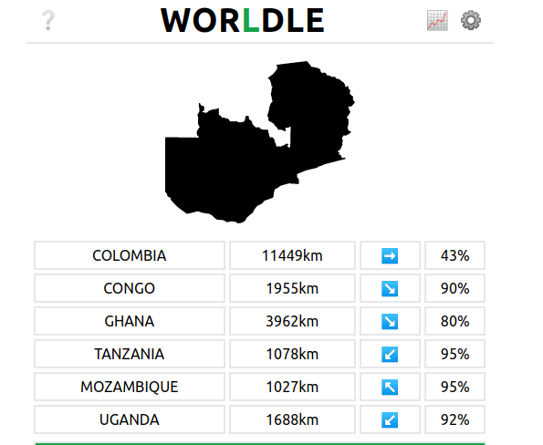 Geography Wordle - players try to guess a specific country instead of any random word. After each guess, the game will tell you how far the actual country is and in what direction you need to go to get there. All in all, a pretty simple concept.
