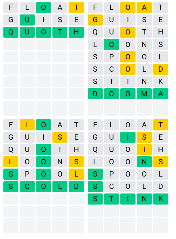 You know what’s better than one Wordle? How about four! Enter Quordle, where players solve four Wordle boards simultaneously. Guesses are propagated to all four boards at the same time and players have nine guesses to solve all four boards. Since it takes four guesses to get each of the four words, nine guesses in total isn’t a lot, and players need to be strategic if they want to have a chance at winning.