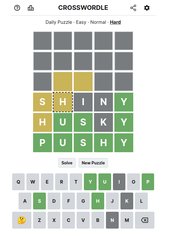 While the core mechanics of the game are a lot different, I find that Crosswordle operates in fundamentally the same way that regular Wordle does. In both games you're given information and need to come up with words that fit the criteria specified. However, while Wordle gives the player a lot more freedom to choose how they go about solving the world, Crosswordle is more like a puzzle since there are only a handful of solutions for a given Crosswordle board. As such, instead of trying to come up with guesses that eliminate as many possibilities as possible, often times the goal in Crosswordle is to come up with guesses that keep in potential guesses to use down the line. As an example, in Hard mode there are 5 additional guesses you need to fill in, and there also happen to only be five vowels in the alphabet. Finding guesses that don’t eliminate too many vowels at the same time then becomes a crucial part of the game. The challenge that Crosswordle provides is certainly a different flavor from that of Wordle or Quordle, but one that I find really enjoyable all the same. Often times the constraints get really tight really fast, and combing through different possibilities to come up with the right words is both engaging and challenging. Finally coming up with a valid solution is thus immensely satisfying, akin to completing a well written crossword. Guess the name fits pretty well then!